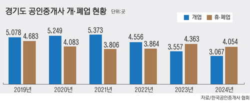 17일 한국공인중개사협회에 따르면 지난 2024년 한 해 동안 경기도에서 신규 개업한 공인중개업소는 3천67곳, 폐업은 3천772곳, 휴업 332곳으로 조사됐다. 휴·폐업 합쳐 4천54곳으로 지난해 문을 연 곳보다 닫은 곳이 압도적으로 많았다.